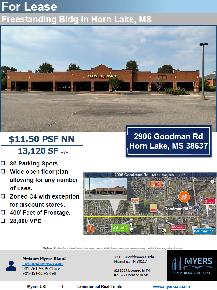 2906 Goodman Road is a 13,120 SF freestanding brick building boasting 400’ of frontage. 28,000 Vehicles per day pass this site for excellent exposure opportunity. Area neighbors include: Walmart, Sonic, Burger King, and Planet Fitness.