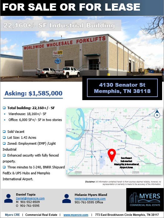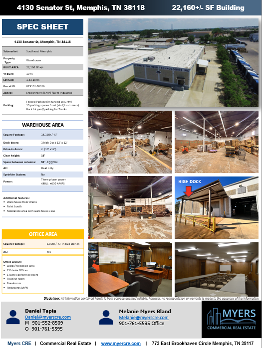 Outstanding warehouse available for lease in Memphis Southeast Submarket/Memphis International Airport Area, only 3 minutes to I-240, BNRR Shipyard FedEx & UPS Hubs and Memphis International Airport, zoned: Employment (EMP) /Light Industrial ideal for storage/light manufacturing.