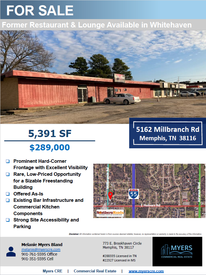 Secure this rare, attractively priced ownership opportunity in Whitehaven. Offered at just $289,000, this property features a full commercial kitchen with vent hood, multiple built-in bar areas, and several DJ booth setups already in place. Positioned on the hard corner of Millbranch Road with convenient access to E. Holmes Road and the nearby highway, the visibility and accessibility are undeniable. This property presents a strong value-add opportunity for an owner-user or investor looking to reposition and customize a former entertainment space to fit their vision.